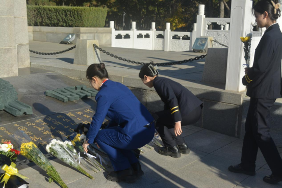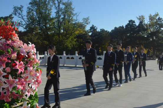 默哀完毕全体师生伫立在烈士纪念碑前,依次献上承载着敬意的鲜花。一枝枝花朵化作一缕缕哀思,传达了民航学子对先烈无声的敬畏与哀悼。