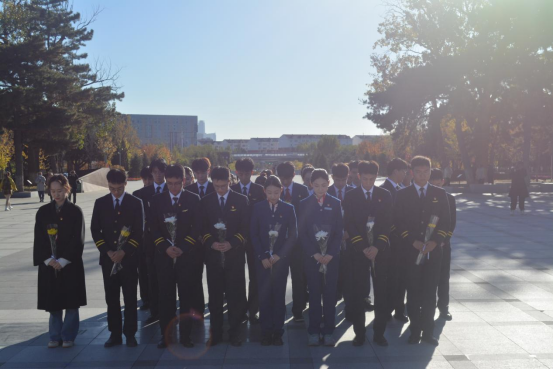 活动伊始,民航学生党员和团学骨干成员在巍峨的抗美援朝英雄纪念碑前怀着崇敬的心情,肃立默哀三分钟以此寄托对革命先辈的敬仰和哀思。